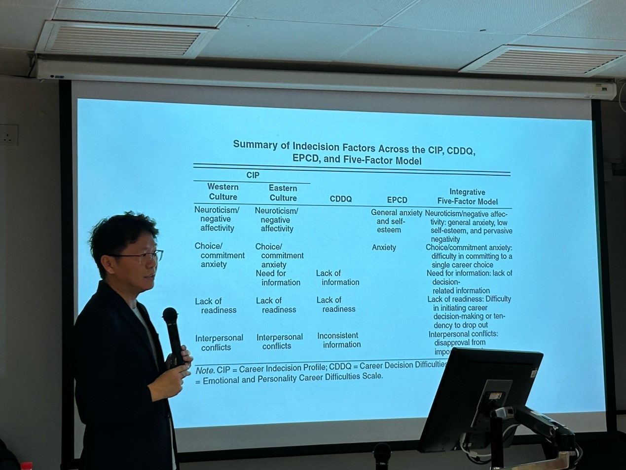 Observing these gaps, Dr. Xu created VocationalCompass based on newer interest and career decision theories. The platform optimizes test items for greater measurement precision, connects to a large occupational database, offers free core functions, and supports both English and Chinese. A key innovation is its interactive, AI-enhanced design. Instead of delivering a static report, the system not only recommends occupations but also explains why certain careers are suggested and why others are not, turning the process into a dynamic reflective dialogue. Dr. Xu emphasized that interests are important and should not be ignored, yet they are never the sole deciding factor. He drew an analogy from psychotherapy: CBT is the most researched approach, but the volume of research does not automatically make it the most effective for every client. The same principle applies to career interests. In addition to interests, he highlighted career decision-making difficulties as another critical element. His platform incorporates an integrated five-factor model of decision difficulties: neuroticism (general negative emotional states), lack of information, choice commitment anxiety, lack of readiness, and interpersonal difficulties. The last factor is especially relevant in East Asian cultural contexts, where parental expectations and financial support often create strong interpersonal pressures.